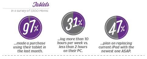The really interesting numbers here are the engagement levels. Even moms without smartphones spend 2.5 hours on average per day on mobile. One-third of moms own a connected device (a non-smartphone). Of these, 9.8% own an iPad, 9.5% own a Kindle and 5.7% own an iPod Touch. And they like to shop from their tablet, too. In surveying 1,500 tablet-owning moms, 97% made a purchase using their tablet in the last month. That’s huge. 31% log more than 10 hours per week on their tablet but log less than 2 hours on their PCs. This is also reflective of the overall trend in the industry that is seeing tablets eat away at PC market share (and quickly). Despite this, many retailers have been shown to be slow to adapt, and are without tablet-ready websites or iPad apps. That leaves room for new companies to come in and give iPad shopping startups a shot, like Pickie for example, or Fab.com., Gilt, Shopmox, etc.