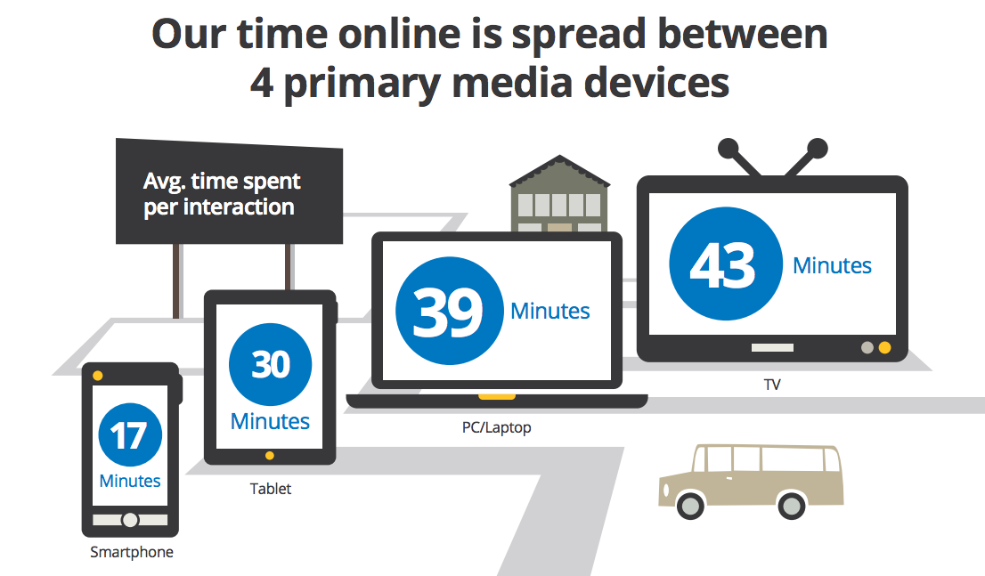 The study also found that although a lot of attention is being focused on smartphones and apps, this device is not only the smallest screen in our world, it’s also used for the shortest bursts, at 17 minutes per day session, compared to 30 minutes on tablets, 39 minutes on PCs and the 43 minutes watching TV.