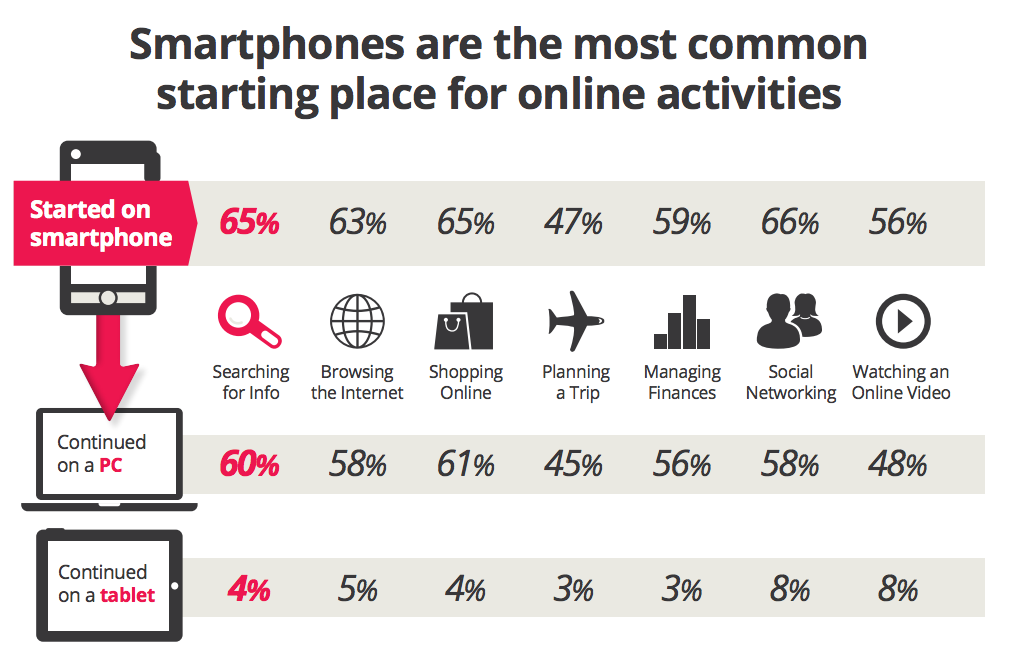 But, while smartphones may have the shortest sessions be used the least overall, they are the most-used when it comes to on-boarding to a digital experience — or sequential device usage, as Google calls it. The research found that a majority of online tasks get initiated on a smartphone while being continued on another device — perhaps with a larger screen for easier use.