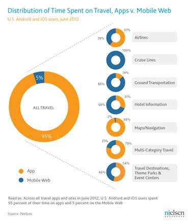 Native app usage has been edging just ahead of mobile web usage among U.S. smartphone owners in the last few months, but when it comes to the category of travel, mobile web use all but disappears from the map. According to figures out today from Nielsen, 95% of all mobile traffic for travel-related content comes from native mobile apps — specifically on iOS and Android platforms. Mobile web — and traffic on operating systems that are not Android and iOS, for that matter — accounts for only 5% of visits.