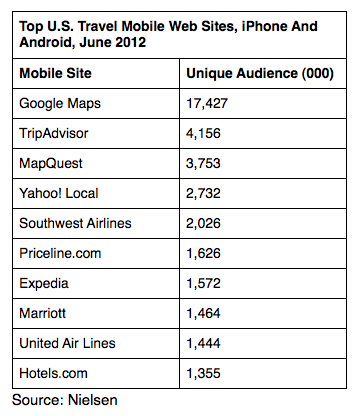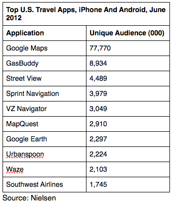 But that’s not to say that other kinds of apps are not also doing well, if in a longtail way. In the overall “travel” category, apps for airlines like Southwest and travel planning aggregators like Priceline.com and Tripadvisor, which bring together different services and multiple smaller players, sit alongside more pure mapping apps in Nielsen’s top-10 lists. These non-mapping apps especially got good traction among mobile web users, where mapping apps took only two of the top 10 slots (but remember, mobile web is still accounting for a much smaller portion of overall mobile travel traffic).