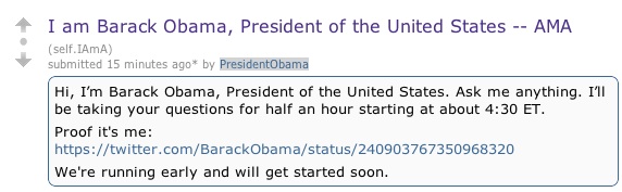 U.S. President Barack Obama is making an unscheduled appearance on Reddit today. Just a few minutes ago, Obama joined Reddit and is scheduled to host an AMA (Reddit slang for “ask me anything”) session starting at 4:30pm ET. Reddit’s moderators have confirmed that this is indeed legit and the questions from Reddit’s users are already coming in at a rapid pace. Obama is scheduled to answer questions for about half an hour.