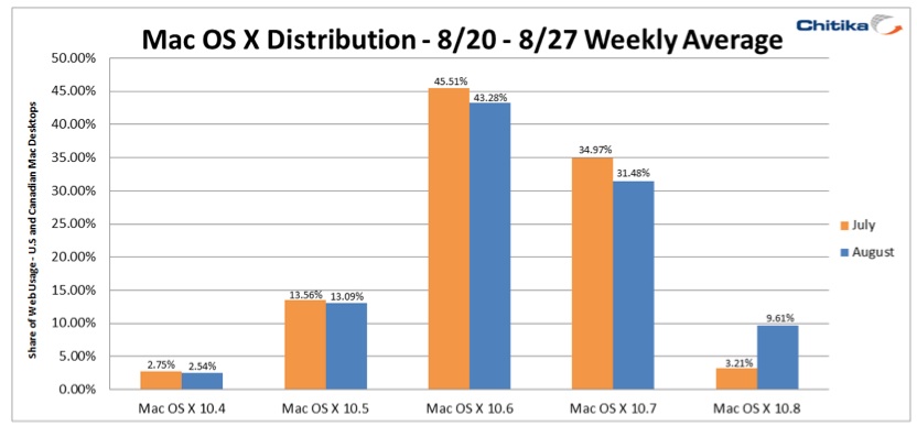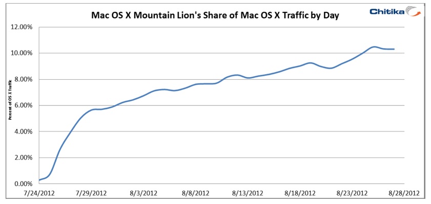 Mountain Lion’s adoption rate, says Chitika, is on track to outperform OS X Lion, its predecessor. It took Lion three months to reach 14% of total OS X traffic on the company’s network. There is, of course, a chance that Mountain Lion’s growth will plateau over the next two months, but if the current momentum continues, the new OS will pass 14% within the next three weeks. Reviews for Mountain Lion were generally more positive than for Lion and, as Chitika’s analysts point out, the new large number of new features make the new OS feels a bit more like a real upgrade than moving from Snow Leopard to Lion.