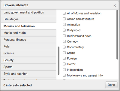Actually, interest data already plays a role in Twitter advertising. Weil writes that Promoted Tweets and Accounts currently target “users who share interests with your current followers.” With today’s launch however, advertisers can explicitly identify the interests that they want to reach. There are currently more than 350 categories to choose from, such as education, home and garden, and animation. Or, instead of targeting a category, advertisers can identify a specific Twitter account, then Twitter will show the promoted content to users who have similar interests to that account’s followers.