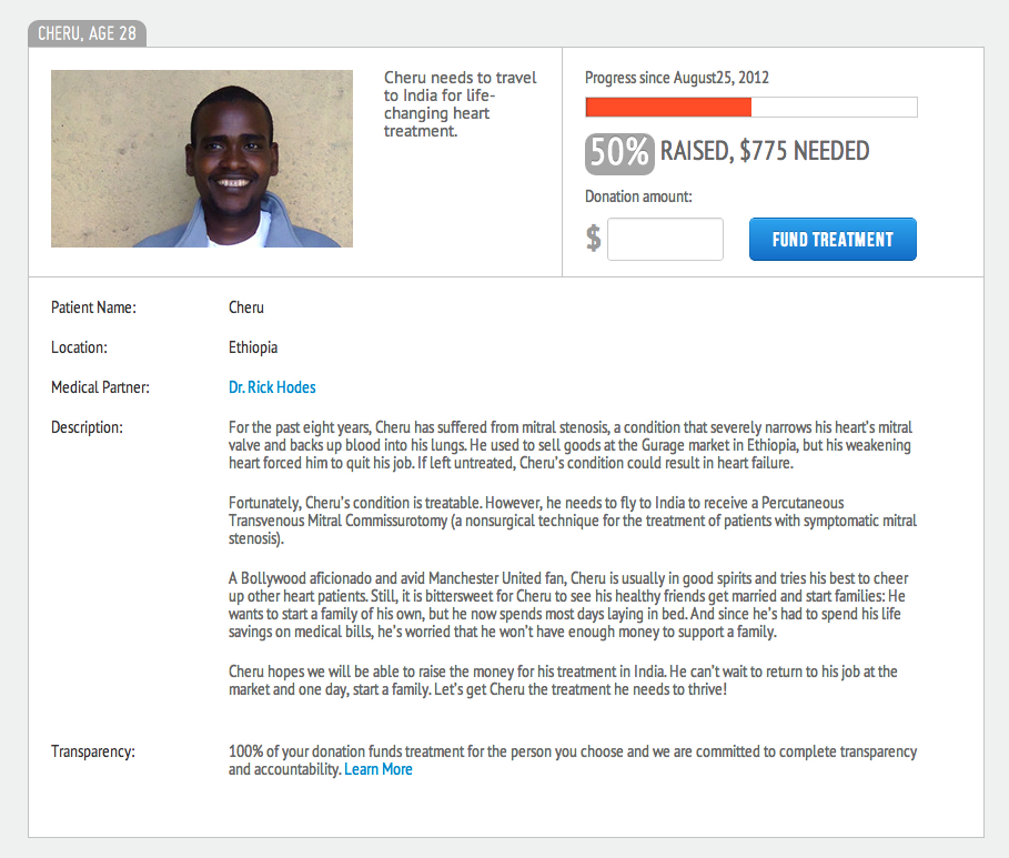 These profiles, or cases, include pictures and synopses provided by the startup’s health care partners in the developing world. For example, take Cheru, whose case appears on Watsi’s homepage. Cheru’s case offers his picture, where he’s from (Ethiopia), who his medical partners are, a description of what treatment he needs and the cost — and a donation button that lets you donate via PayPal (whose fees are included in the cost of treatment).