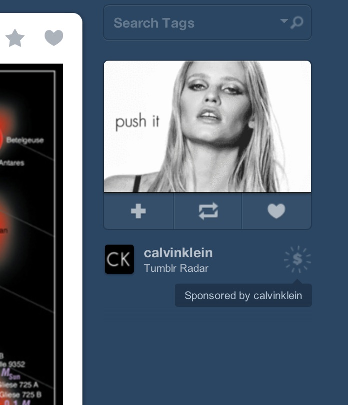 It’s here on Radar where the ad for Calvin Klein ran, featuring an animated GIF as the eye-catching image. And although this is the first time some folks spotted the animated GIF format (see, for example, David Chatier’s post and a reblog from MG Siegler, a Tumblr investor via CrunchFund), Tumblr says this is not actually the first advertiser to have used the GIF format. Other advertisers who have advertised via animated GIFs have included Coca Cola, Puma, American Apparel, MTV, VH1, Adidas, College Humor, and the movies “The Expendables 2,” “Ruby Sparks,” and “Beasts of the Southern Wild.” In total, around a dozen sponsored GIFs have run over the past two months, alongside other types of ads.