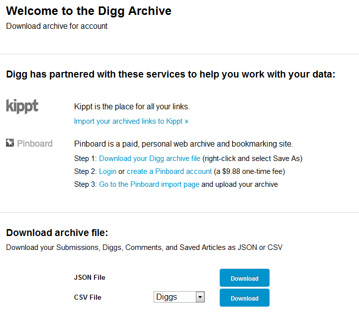 Yesterday, the team did just that and actually seems to have gone beyond what is usually characteristic for new management or a deadpooled/acquired startup to do in terms of access to historic data. They launched the “Digg Archive,” a tool that lets users of the old site (i.e. before July 2012) retrieve their Diggs, submissions, saved articles, etc.