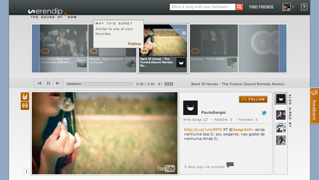 You can choose to follow them to get the music that they share in your playlist. In other words, Serendip helps you find your music soul mate, the person with whom you share the same taste in music.