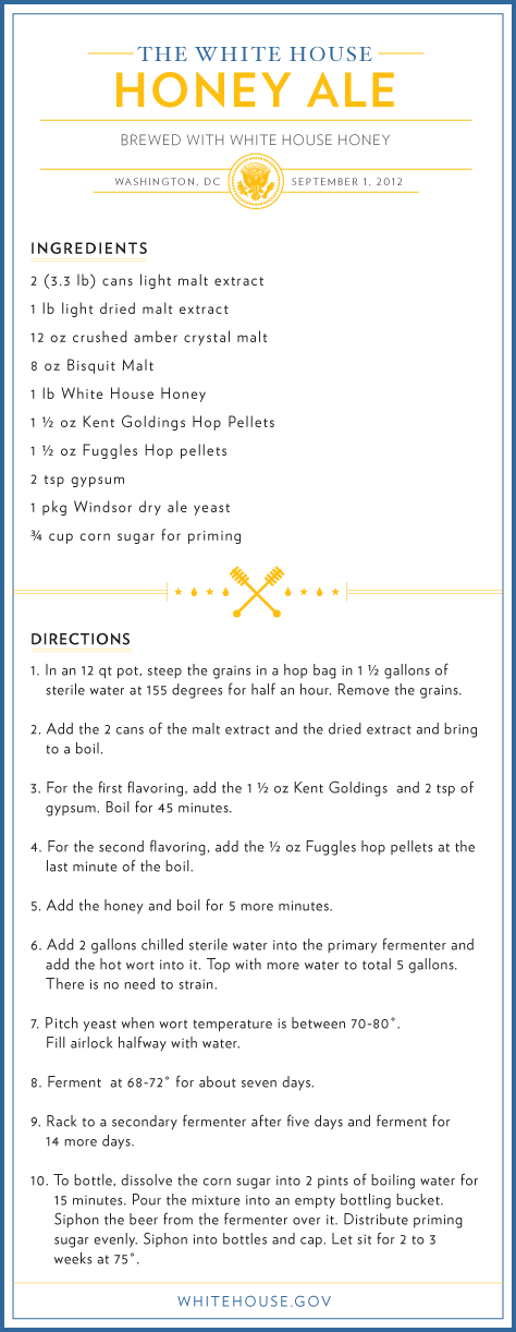Ready your grocery list for Labor Day: the White House has released the recipe for its official home brew, The White House Honey Ale. In a pun-tastic blog, Assistant Chef, Sam Kass, buckled to overwhelming demand from the White House online petition platform, We The People, “with public excitement about White House beer fermenting such a buzz, we decided we better hop right to it.”