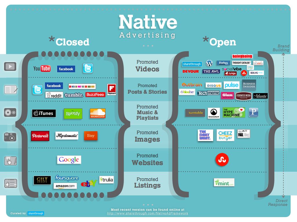 In closed native advertising systems like Facebook and Twitter, brands can create and promote customized content within the platform itself; however, that content cannot exist outside of the confines of that same platform. A closed native advertising system is a great way to increase the stickiness of a publisher’s site, as brands have to create their own profiles and content within the platform, such as Facebook’s Promoted Posts. For publishers that are in their early stages, it makes sense to utilize an open native advertising model to quickly plug in brand content to native placements and use those performance insights to inform them on whether it makes sense to build out their own closed system. Open native advertising allows brands to use a single piece of brand content across multiple campaigns, which cuts down on their expenses and implementation time. Examples of open native advertising platforms include Outbrain and Disqus for recommended content widgets and Sharethrough for sponsored videos.