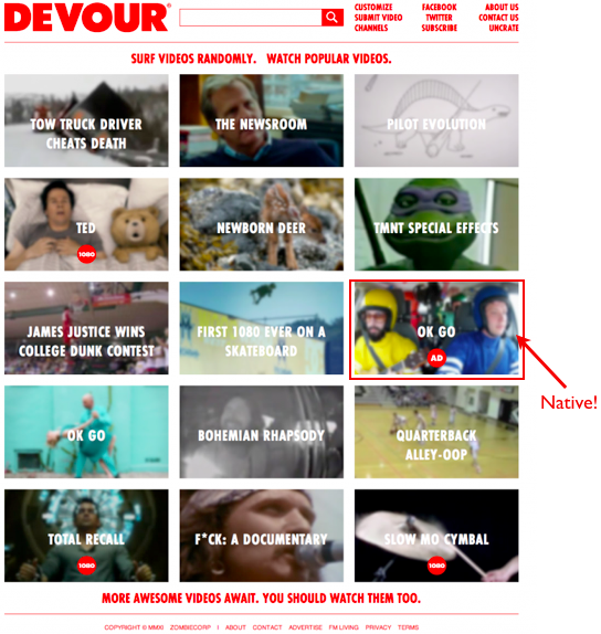 Branded content is promoted within grid units that are primarily image-based with limited space for accompanying text. Devour’s homepage exemplifies a curated grid layout with a well-integrated native ad placement.