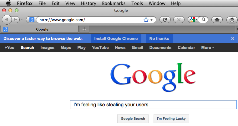 Google is now pushing an aggressive Chrome marketing campaign once used to steal users from other browsers. For some, every time they boot up Firefox or Internet Explorer with Google.com as their home page they see a bar asking them to install Chrome. “Discover a faster way to browse the web” it pleads.