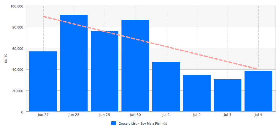 A sign of a good app, maybe. Buy Me A Pie! is certainly well designed and simple to use, ratcheting up an average user rating of 4.5/5 in the App Store globally. It’s powerful too — the built-in cloud storage and synchronisation across Web and iOS clients sets it apart from most of the simple list-making apps out there, competing most directly with VC-funded ZipList. But it’s also a sign of good marketing. That organic growth strategy has included regular app promotions and giveaways, temporarily reducing the app’s price to zero in order to drive visibility in the App Store.