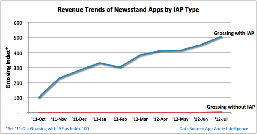The revenue generated by Newsstand applications comes almost entirely from in-app purchases integrated into the app. Eighty-eight percent of Newsstand apps offer this feature and generate 99.5% of Newsstand revenue globally. Or to put it another way – the 12% of Newsstand apps without in-app purchases generated less than 0.5% of global revenue.