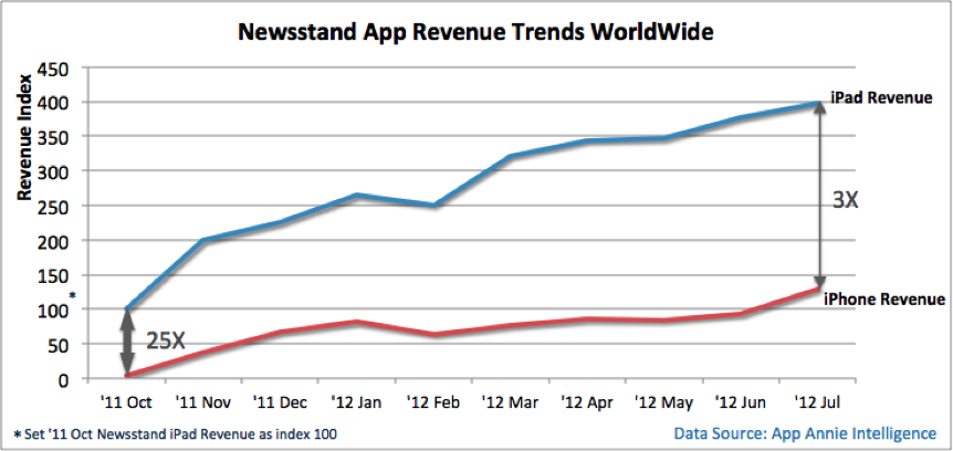 iOS users also prefer the iPad when it comes to reading their Newsstand applications, as iPad Newsstand revenues are three times the size of those on the iPhone, App Annie found. That’s not to say Newsstand adoption on iPhone hasn’t been growing – iPhone Newsstand revenue has grown by over 3,200% since the app’s launch. But even though the iPad audience is smaller, App Annie says publishers need to focus on monetizing their iPad users since they’re the primary source of revenue.