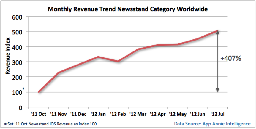 In advance of the expected new iPhone launch taking place on September 12th, app analytics firm App Annie has taken a look at some of the traction Apple’s Newsstand is seeing in terms of both revenue and downloads. According to its data, the U.S. is the top country when it comes to revenue generated by Newsstand applications, but China leads in downloads. App Annie also found that iOS Newsstand revenue has more than quadrupled since its launch, and the revenues on iPad are three times the size of those on iPhone.