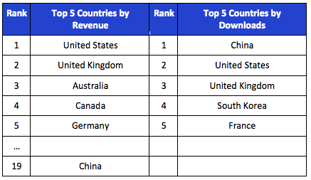 Globally, Western countries lead in Newsstand revenue per download, with the top being Norway, Australia, Switzerland and the United Kingdom, with the U.S. in the eighth position. Across the top ten, revenue per app is $0.97, more than 2x the world average of $0.45. Seven of the top ten are English-speaking, nine are in the Top 25 by GDP per capita, and five are European. Meanwhile, China claims the most downloads, beating the U.S., U.K. South Korea and France in the top 5. It also accounts for 7 of the top 20 downloaded Newsstand apps by country origin of publisher, followed by the U.S., U.K. and Canada.