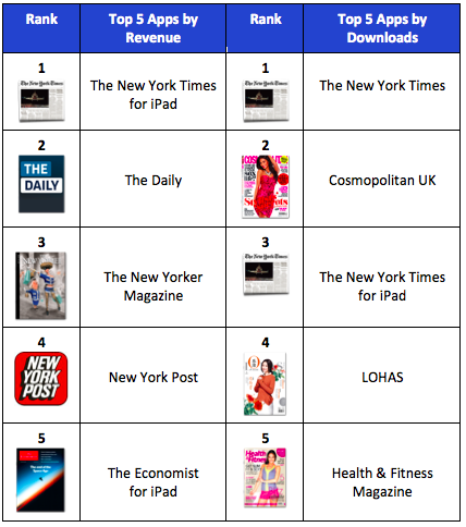Newsstand is also emerging as a way for older print publishers to grow their digital reader base more than it’s providing a pathway for new startups to become breakout hits. The top five apps by downloads and revenue tend to include familiar names like The New York Times, Cosmopolitan and The New Yorker, for example. NYT actually claims the top spot on both charts. However, App Annie places News Corp-backed The Daily in the #2 position on the revenue chart, which paints a brighter future for the company than what may be in store – well, at least according to some recent reports on the matter. (For what it’s worth, The Daily’s Editor-in-Chief responded in July that rumors of its imminent demise were “misinformed” and “untrue.”)