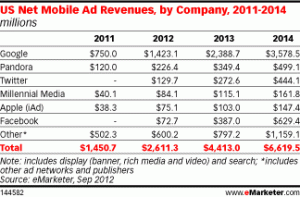 However that is bound to be reversed over time: eMarketer predicts that by 2014, Facebook will be making $629.4 million in mobile ads, compared to $444 million for Twitter, putting Facebook at a distant second to Google. Longer term, eMarketer predicts that U.S. mobile advertising will generate sales of $12 billion by 2016.