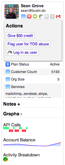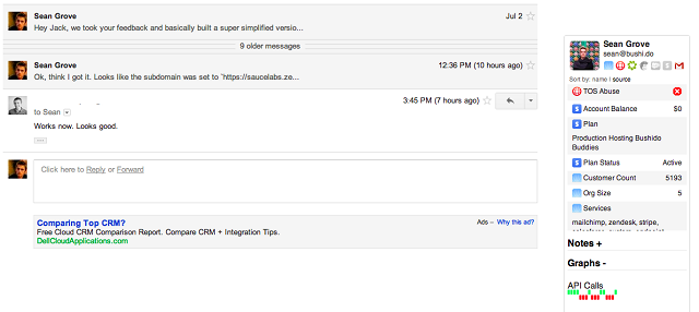 It also displays that same information when you hover over an e-mail address on any website, meaning you can see this unified view of your customers’ information from any web-based application that displays their e-mail addresses. Grove gave an example use case: a user had a couple harsh comments left on their blog. They wanted to know whether those comments were from paying customers or from, for lack of a better word, trolls. Using Zenbox they were able to immediately see that one comment came from a good, paying customer. The other came from a “problem user” who had never paid. That made it easier to prioritize responses without having to dig through a CRM or help desk application.