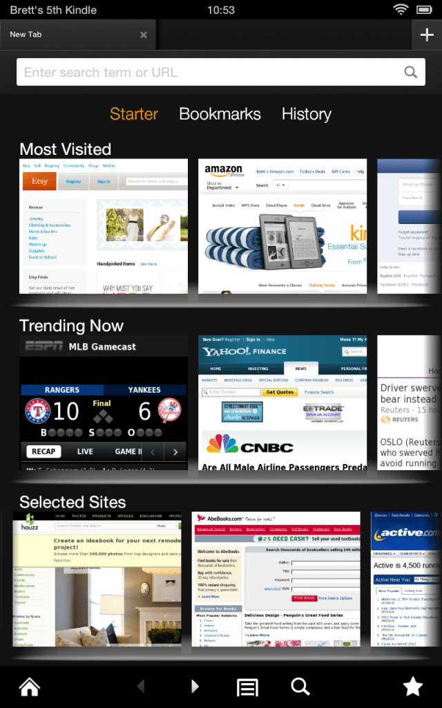 The Start page has also become more organized, no longer displaying a haphazard collection of recently visited sites and bookmarks. Now, those two items are separated, and the Start page itself includes the “Trending Now” section as well as a new section called “Selected Sites” which Amazon says will display other webpages it thinks customers might find interesting. And how does it know what customers might find interesting? Oh right, all that data it’s tracking. Google Zeitgeist, look out. Amazon is starting to build one of its own.