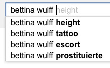When you search for “Bettina Wulff” on Google, the search engine will happily autocomplete this search with terms like “escort” and “prostitute.” That’s obviously not something you would like to be associated with your name, so the wife of former German president Christian Wulff has now, according to Germany’s Süddeutschen Zeitung, decided to sue Google for defamation. The reason why these terms appear in Google’s autocomplete is that there have been persistent rumors that Wulff worked for an escort service before she met her husband. Wulff categorically denies that this is true.