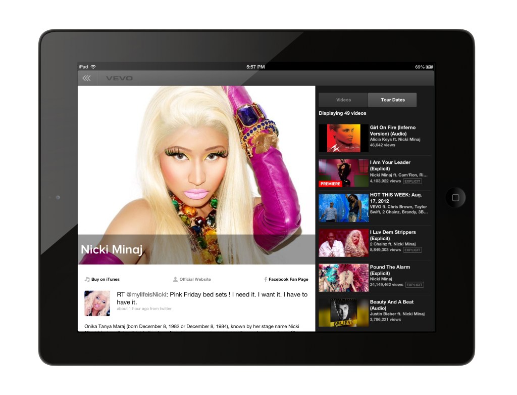While the iPad app is one recent innovation for VEVO, it’s not the only one. The company is looking for new ways to reach consumers wherever they are — whether that means making embedding videos available in users’ Twitter streams (which is available now) or streaming directly within Facebook wall posts (which could be coming soon). Look for more updates as time goes on!
