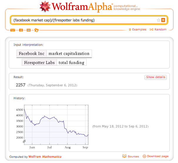 They focused first on previous Disrupt finalists. For example, you can now compare the funding history of Ark, DataSift and Firespotter Labs — developers of Disrupt NYC 2012’s winner service UberConference. You could imagine any sort of computation, with macroeconomic data or any other data available in Wolfram Alpha. For example, Facebook market cap is 2257 times Firespotter Labs’ funding — but this number is slowly going down.