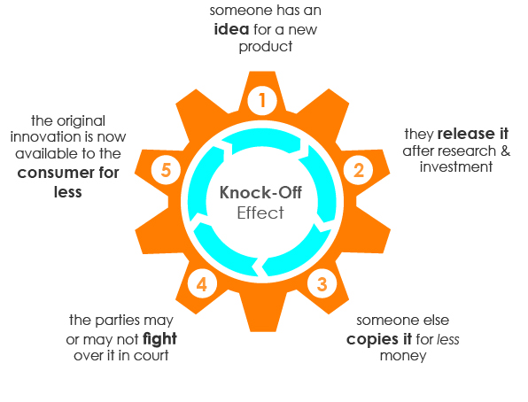 This is how the Knock-off Effect works: someone has an idea for a new product which they release after research, development and investment. Someone else copies it for less money (because that is their nature) and in a much shorter time span as the hard part has already been done. The parties may or may not fight over it in court, but regardless, the premium the innovation commands is diminished. The innovator reacts to protect their market share by going out and making something new (because that is their nature) and the cycle repeats, meanwhile the original innovation is now available to the consumer for less.