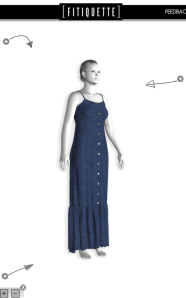 It works like this: You create a mannequin out of different body types, and then you further adjust each specific measurement across your body (breasts, hips, etc.) until it closely mirrors your own. Then, Fitiquette provides clothes at suggested sizes that could work with those measurements — playing on the fact that usually a few different sizes can fit you, so this is to see how each would actually look. You click on each size, the mannequin puts that piece on; and then you can zoom and spin the model to see the result at different angles.