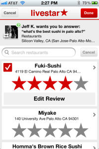 Livestar, which is officially launching at TechCrunch Disrupt in San Francisco today, wants to help you find personalized recommendations from your friends and authoritative sources around the web. Livestar, which is currently only available on the iPhone, argues that most of the major review sites like Yelp and Amazon are due for disruption, because they don’t offer personalized ratings and often suffer from low-quality reviews. The best sources for recommendations, the company says, are your friends and professional critics you already know, but finding their opinions is often tough. Livestar currently focuses on restaurants, movies, and music, but the company plans to add apps and wine recommendations soon.