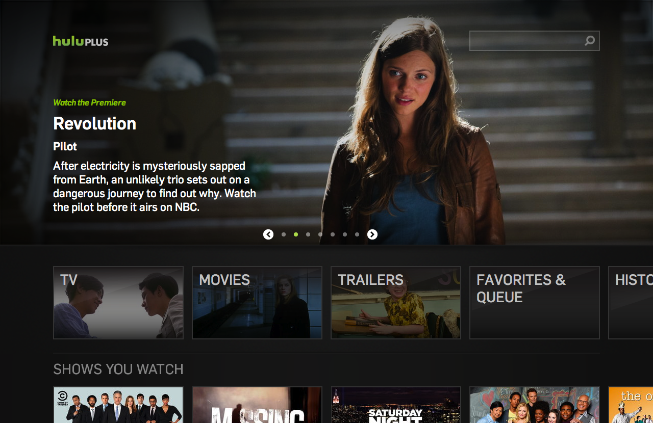 We’ve implemented a tray-style format that allows you to scroll through recommendations based on your viewing history, or check out popular shows and movies, the top 100 clips on Hulu Plus, movie trailers and more.