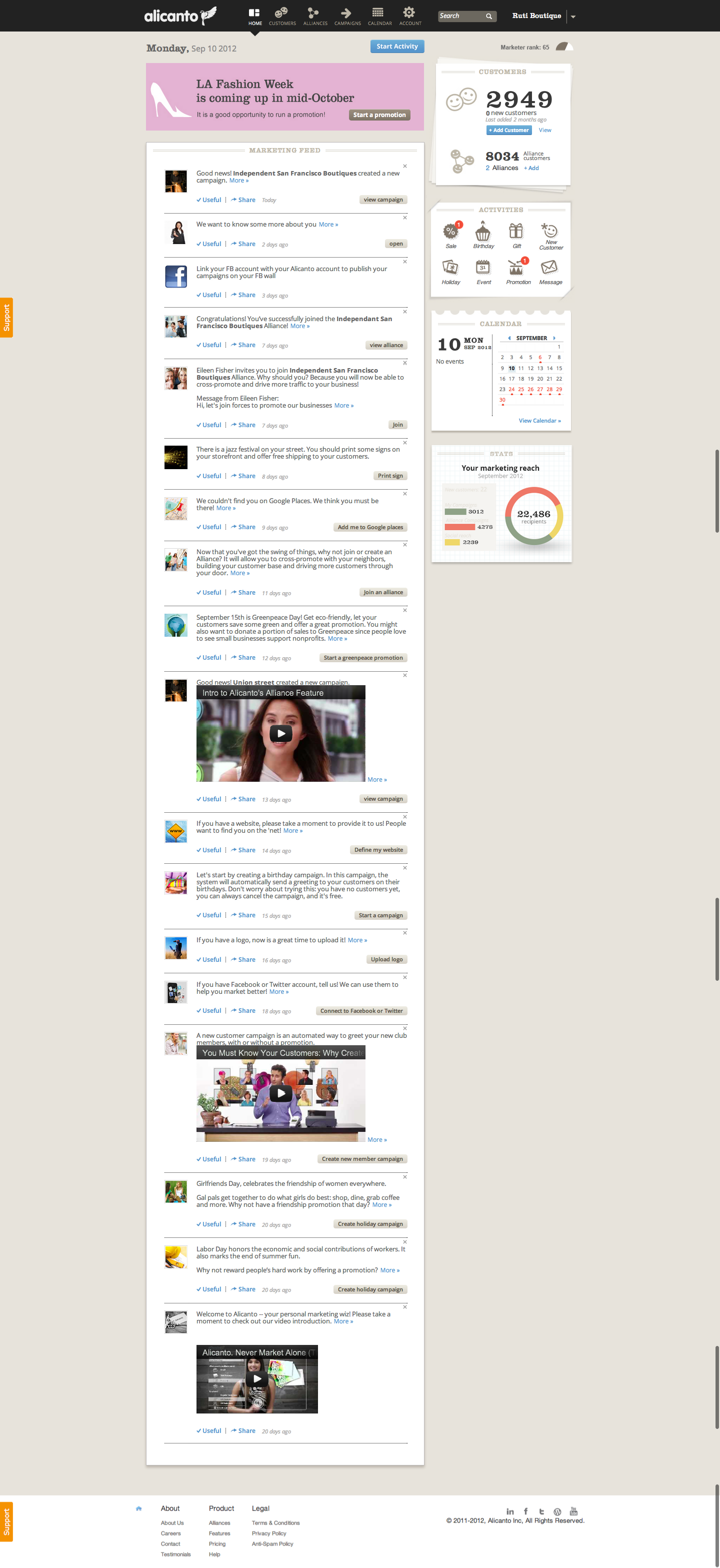 Alicanto uses a news feed as the dashboard for customers to show the history of the recommendations. A calendar shows when the campaigns took place. The service is designed with search engine optimization technology.