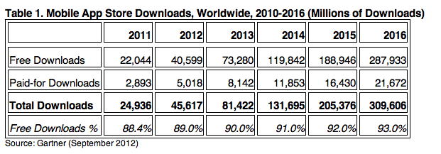 These are pricing trends that will only become stronger. By 2016, Gartner is predicting the the mobile app market will see almost 310 billion downloads, with 93% of those free apps. These numbers point to growing opportunities for those companies that help app developers monetize their apps in other ways: not just through mobile advertising, but also through developing models for in-app purchases, subscriptions and other ways to get users to pay later for content. Indeed, in-app purchases, Gartner predicts, will drive 41% of all app revenues by 2016.