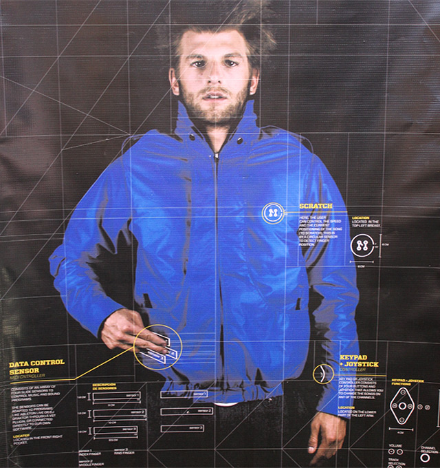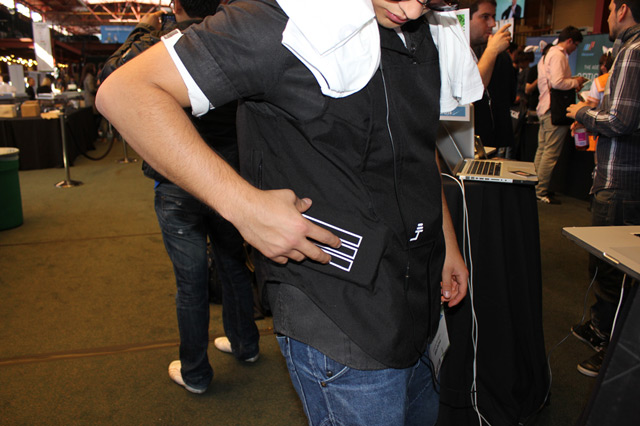So you can effectively trigger and alter tones by moving your fingers accross the three sliders on the front of the vest. You can also affect the speed of a beat or sample by moving your arm and the accelerometer in the sleeve. This is a cool concept and an interesting and kinetic way to trigger and control beats and sounds. It works with a custom Mac OS X application that the company also created, with iOS versions soon to follow (for maximum portability).