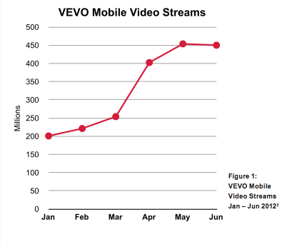 According to the report, VEVO’s most popular mobile platform is iOS, and its mobile traffic nearly doubled in Q2 2012 from the same period last year, with over 1.3 billion streams globally. Meanwhile, VEVO saw 450 million mobile video streams globally in June.