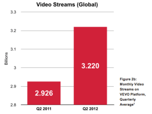 However, in month-to-month viewership, VEVO saw a decrease in overall traffic — which it says was less than 10 percent. It attributed this dip to both the “change in priority for what YouTube” — VEVO’s most important syndication partner — “promotes in its home pages” as well as seasonality, with Q2 generally having fewer music releases from big-name artists, something the company expects to increase in Q3 and Q4.