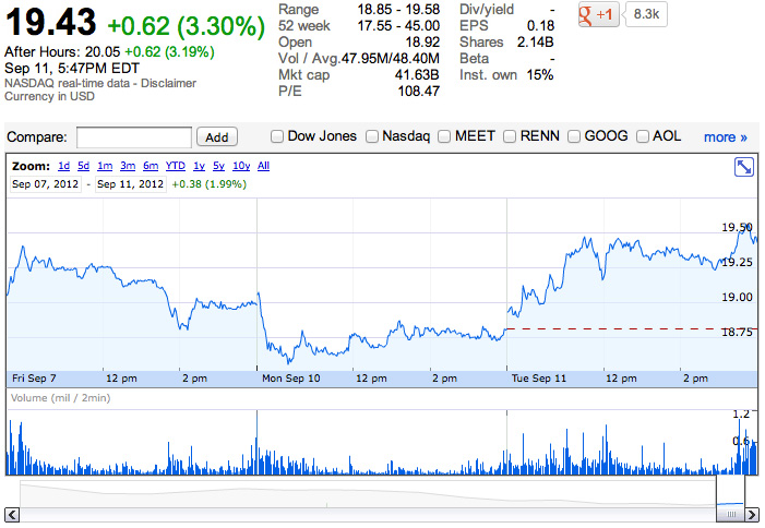 The stock closed at $19.43 today but rose to $20.32, up 4.58% in after hours trading right after Zuckerberg left the stage. Since then, the stock has declined a bit in after hours trading, but is still above $20 at $20.05, up 3.19% in after-hours trading (updated as of 5 PM PST).