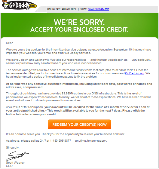 Following its lengthy outage on Monday, hosting provider GoDaddy today sent an e-mail to customers containing a mea culpa and a credit good for one month of free service for each “active/published” site the customer hosts with GoDaddy.
