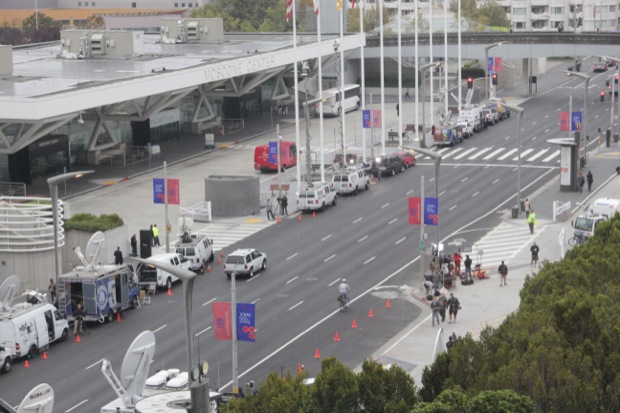 The scene you see above is a scrum of TV journalists and their trucks getting ready to cover the event live, on location, and as it happens, but we’ll do them one better: we’ll be live-blogging the event right here in a few hours.