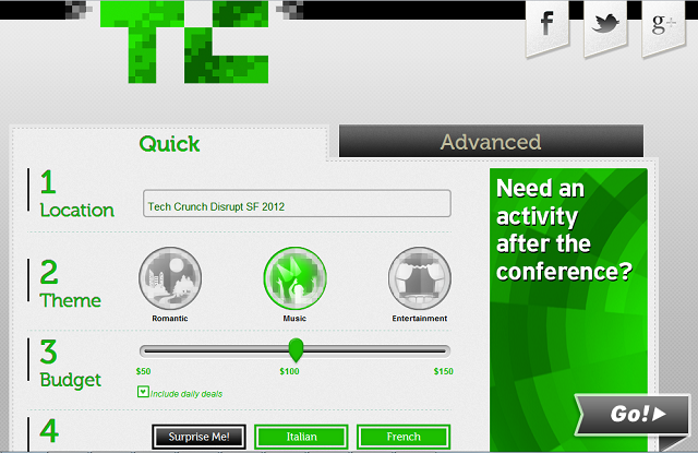 Dateini takes a cut of ticket sales, car reservations, and other transactions conducted through the service. It’s also offering a “white label” version that companies can use. For example, a conference organizer or hotel could offer it as a branded service to customers looking for a night out on the town in an unfamiliar city. Tal says the company is already working with an airline on a white-label service. Here’s a mock-up of a TechCrunch version: