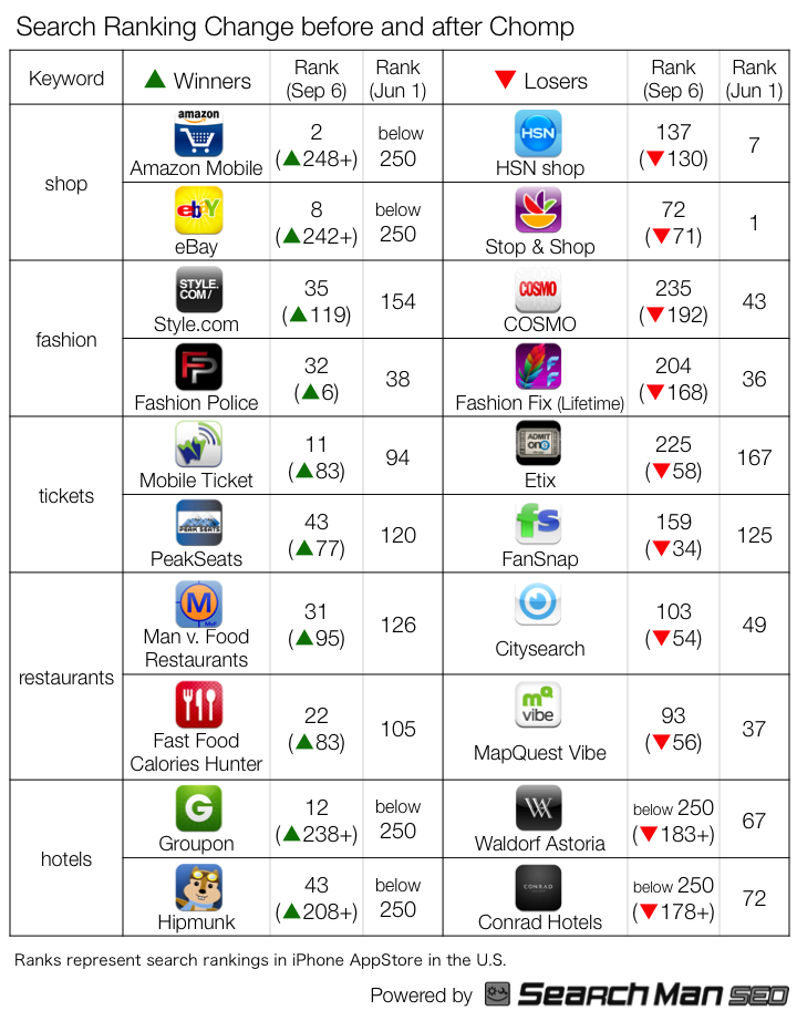 In SearchMan’s analysis, the company took two snapshots of app store data – one from early June and another from September 6th. Although the apps it chose to examine are only a very small sliver of the overall App Store, it’s clear that the Chomp integration is already impacting rankings for some big brands. Following a similar analysis the firm did for the Japanese market, SearchMan found that in Shopping verticals, dominant retailers and e-tailers like Amazon and eBay gained in search visibility, while those with older business models like Home Shopping Network and Shop & Stop lost ground. The trend to favor newer companies was spotted again as older web ticketers like eTix and FanSnap dropped in rankings and mobile ticket centric companies like Mobile Ticket and PeakTicket gained.