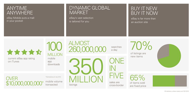 He said that as the marketplace evolved, it was time for the branding and logo to change, too. As we heard in July, eBay’s mobile apps have been downloaded 100 million times, and the company expects more than $10 billion in volume transacted via mobile this year. And the marketplace is seeing 260 million searches a day, with 350 million product listings on the site.