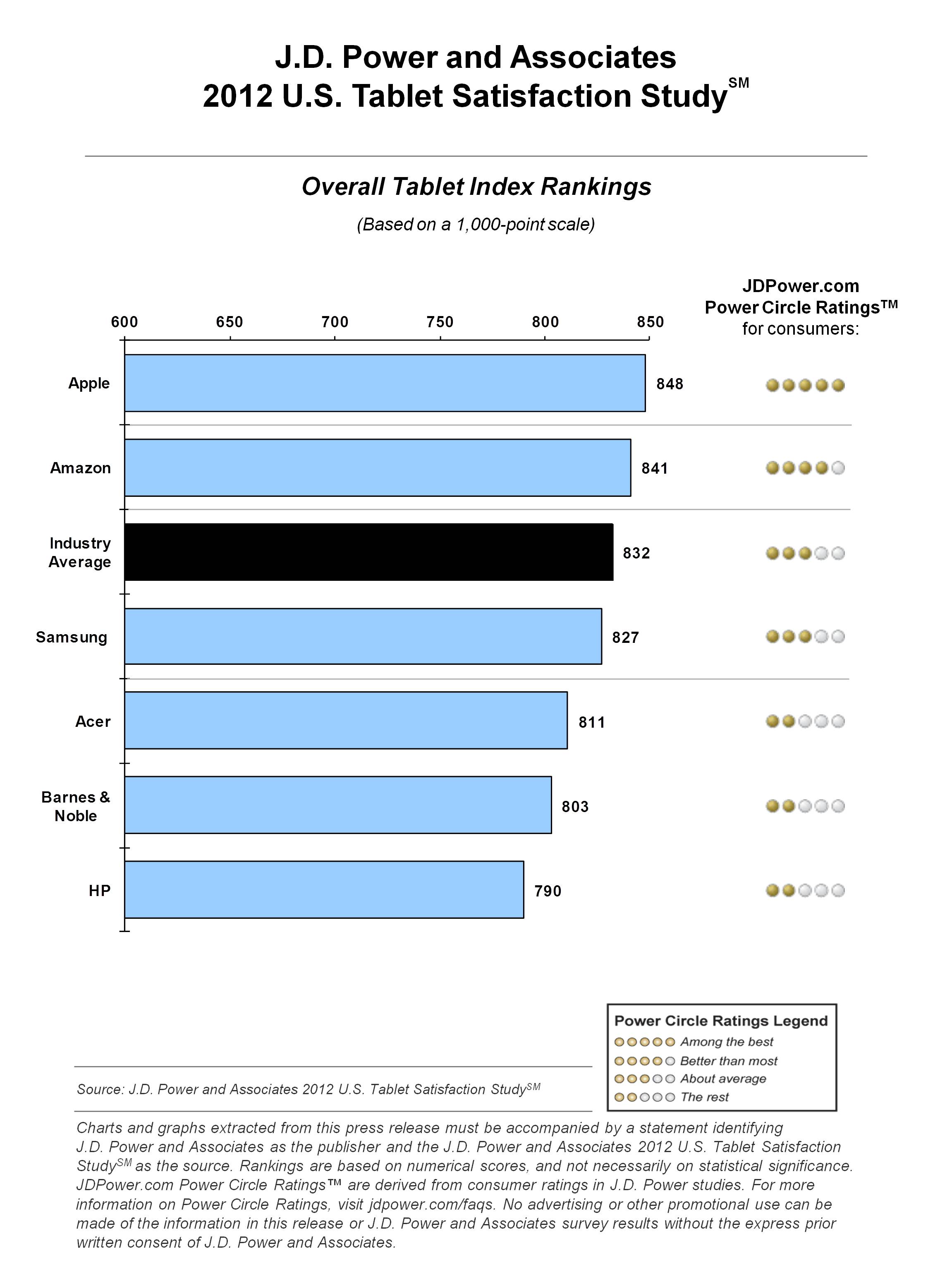 In its tablet rankings, J.D. Power asks users to rate products in five categories and then weights them in different proportions: performance (26%), ease of operation (22%), styling and design (19%), features (17%), and price (16%). It notes that Apple’s score of 848 came largely from being the first in performance, ease of use, styling/design and features, while Amazon beat it out on price.