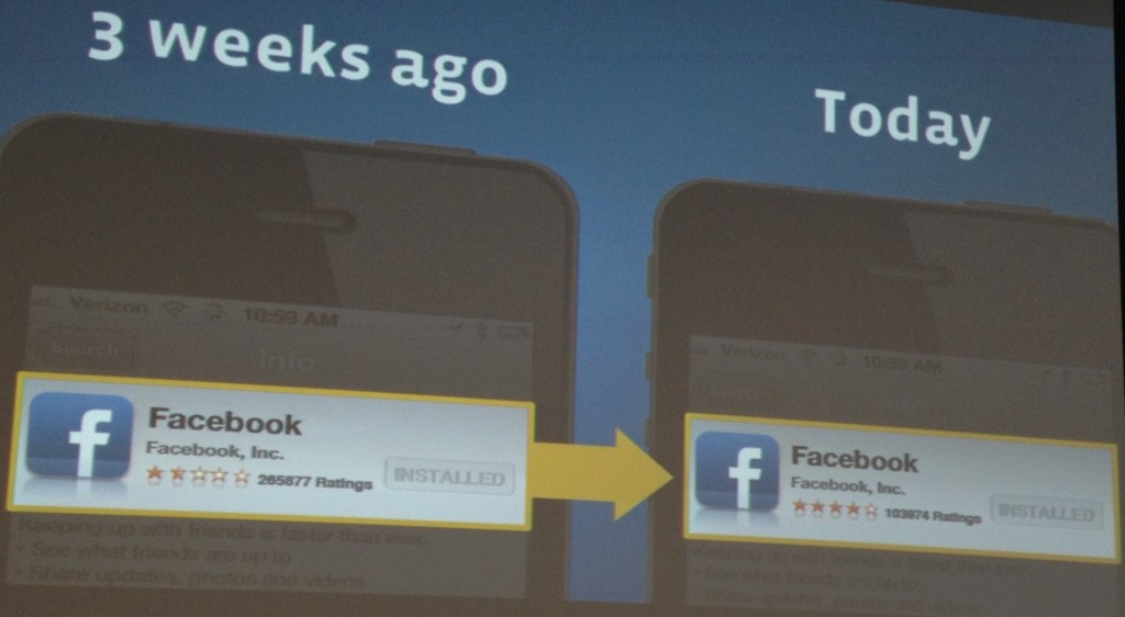Facebook will still push HTML5 innovation, but stripping it out to speed up the Facebook for iOS app has been very successful. Half of its iOS users updated their apps in just four days, and its App Store review average has risen from 1.5 stars to 4 stars in just three weeks since relaunch, Facebook told reporters at its headquarters today.