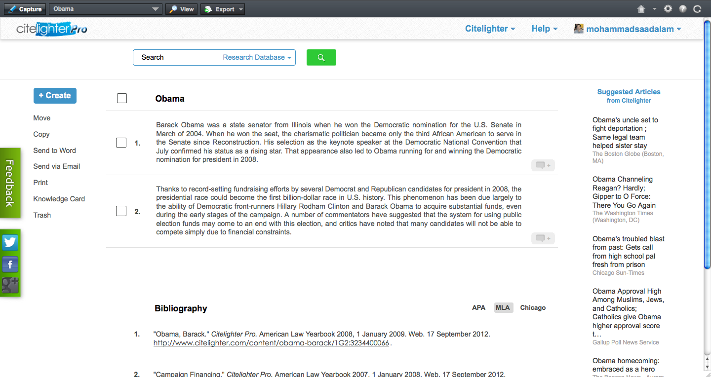 Citelighter, on the other hand, offers a number of research and academic-focused tools that let you grab specific facts and do something useful with them, i.e. export facts, comments, in-text citations, and a fully-formatted bibliography — all into a Word document with a few clicks.