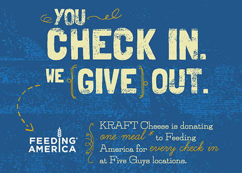 It’s all quite simple: check-in at Five Guys Burgers and Fries, and KRAFT will donate the equivalent to Feeding America. Here’s what foursquare had to say:
