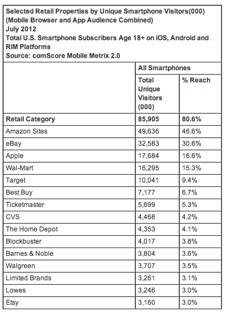 Today, comScore released a study on U.S. smartphone behavior with respect to retail and shopping. The study found that 4 in every 5 smartphone users, which represents 85.9 million U.S. users, accessed retail content on their device in July. Amazon was the top retailer with an audience of 49.6 million visitors, followed by eBay with (32.6 million visitors) Apple (17.7 million visitors), Wal-Mart (16.3 million visitors), Target (10 million visitors) and Best Buy (7.2 million visitors).