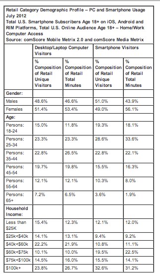 comScore also broke down the demographics of mobile shoppers. Across both smartphones and desktop computers, males and females represented nearly equal proportions of retail category visitors. However, females accounted for a higher share of time spent on retail destinations at 53.4 percent of minutes on desktop computers and an even greater share of retail minutes on smartphones at 56.1 percent.