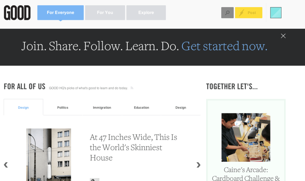 Also: Good is not totally abandoning its editorial role in the endeavor. It will be curating content on the site, featuring certain stories — including from its own magazine — on the site’s homepage and in other areas. And it will also be on the lookout for people who post things that are not kosher — that is against the ideals of community spirit and so on. Those who post spammy content, Goldhirsh tells me, will be warned; totally inappropriate content might simply be removed altogether.